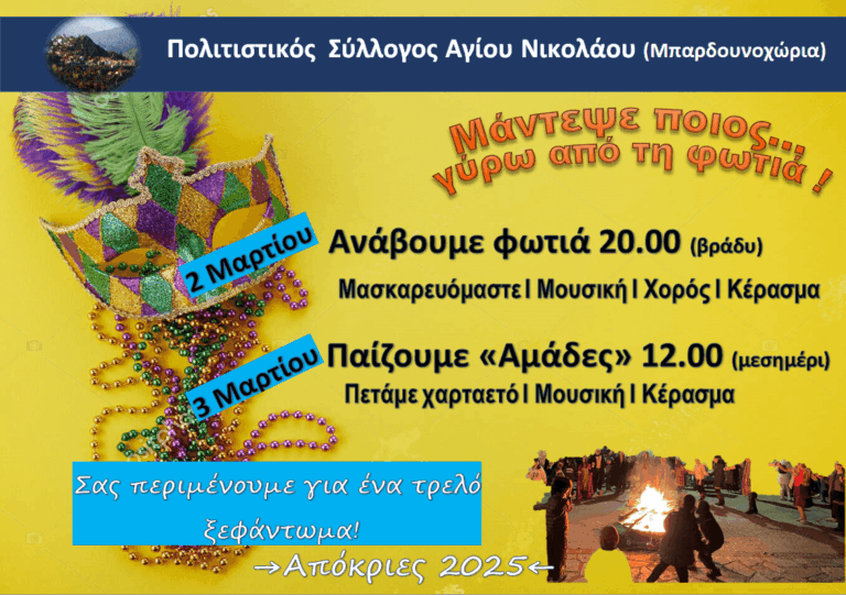 Ο σύλλογός μας σας προσκαλεί σε μια αποκριάτικη δράση που θα πραγματοποιηθεί στο χωριό μας στις 2 και 3 Μαρτίου.…