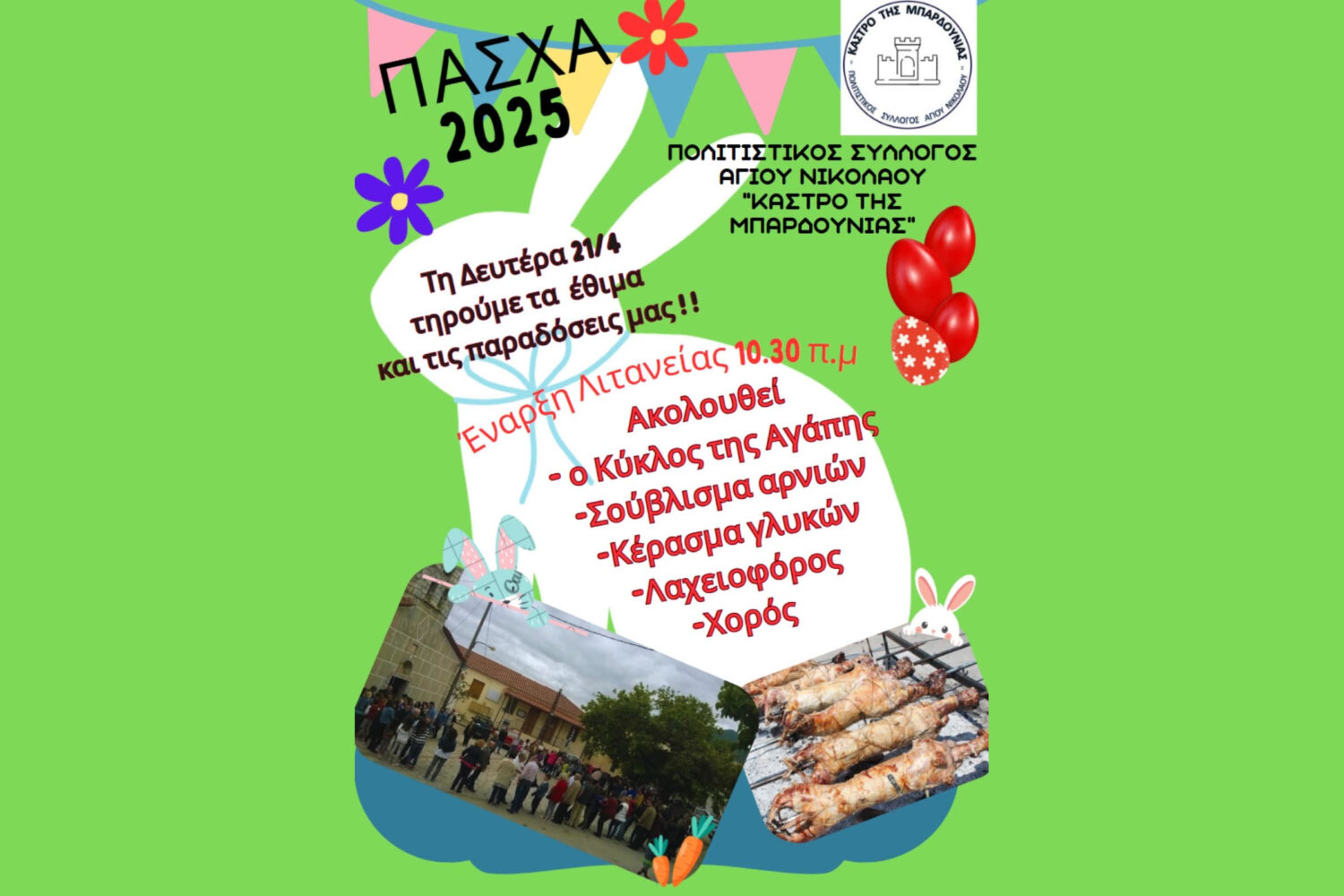 Ο Πολιτιστικός Σύλλογος Αγίου Νικολάου “Κάστρο της Μπαρδούνιας” σας προσκαλεί με χαρά και ενθουσιασμό στη μεγάλη Πασχαλινή Γιορτή, που θα πραγματοποιηθεί τη Δευτέρα του Πάσχα, 21 Απριλίου 2025,