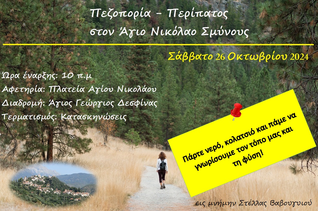 Σας προσκαλούμε όλους να συμμετάσχετε στην πεζοπορία που θα πραγματοποιηθεί το Σάββατο 26 Οκτωβρίου 2024 στο χωριό μας ‘Άγιο Νικόλαο Σμύνους. Η εκδήλωση αυτή είναι μια μοναδική ευκαιρία να ανακαλύψουμε τις ομορφιές του τόπου μας, να απολαύσουμε την καθαρή φύση, και να περάσουμε όμορφες στιγμές όλοι μαζί.